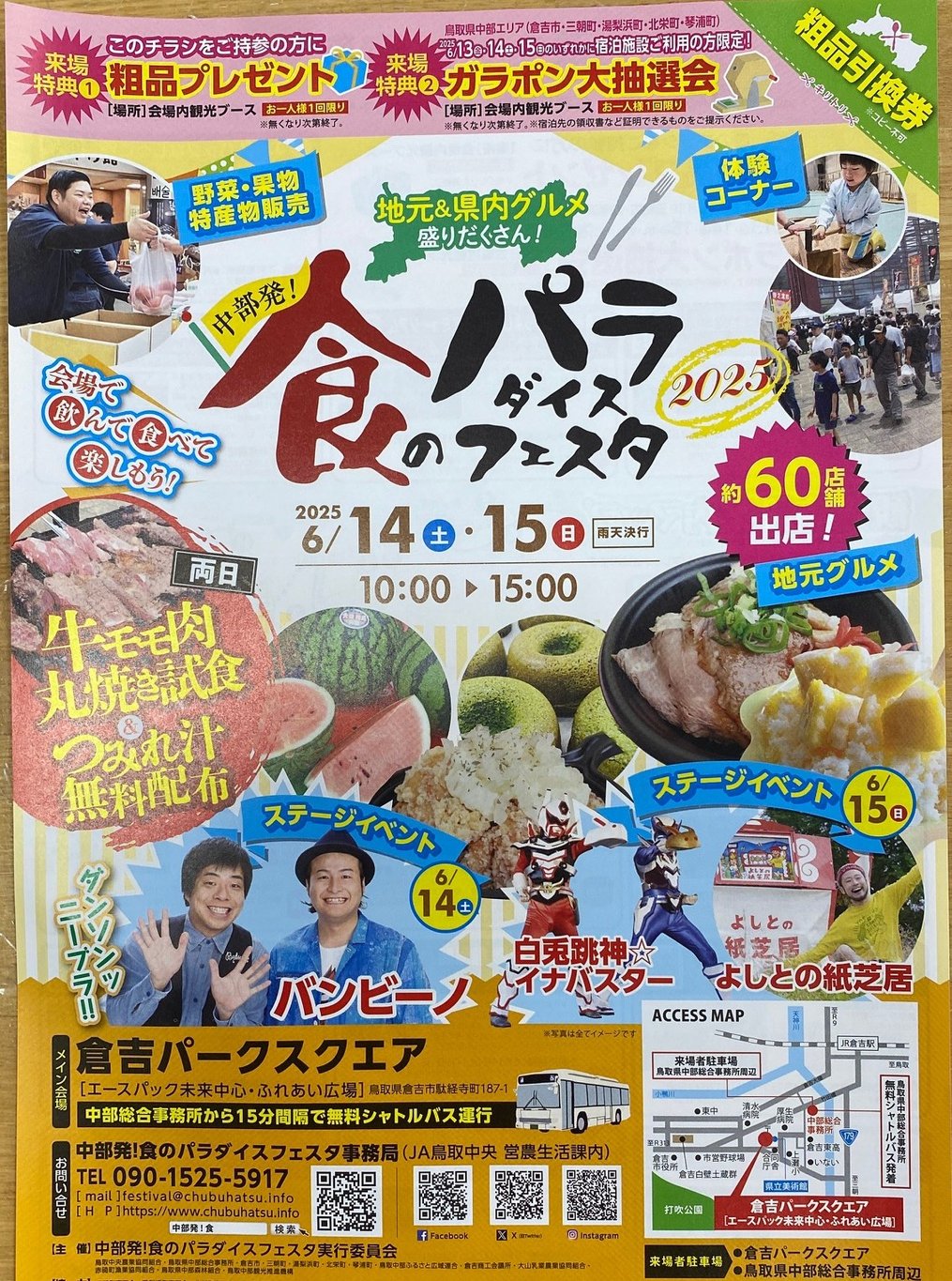 鳥取県中部の ”うまい” が大集合‼ 鳥取和牛バーガー、ホルモン焼きそば、小籠包、牛骨ラーメン、大山地鶏、牛もも肉丸焼きなどなど・・・ 出店店舗数 なんと60店!(昨年度実績) 旬のスイーツやグルメを味わいながら、バンビーノのステージを観覧するもよし! 食べ歩くもよし! ステージイベントや体験イベント、マジックショーもやってます!...