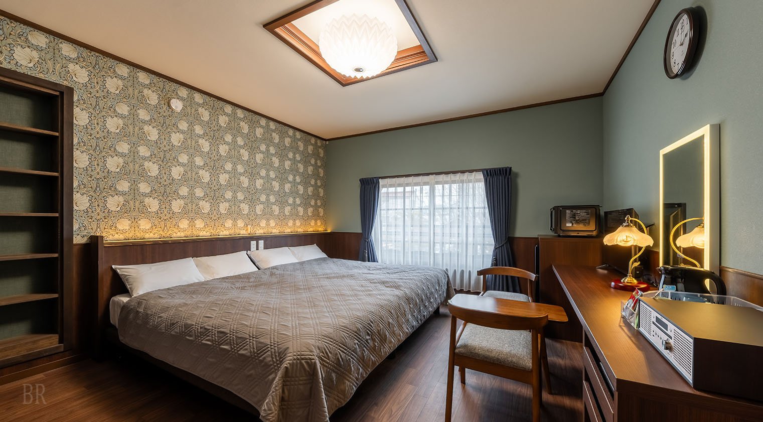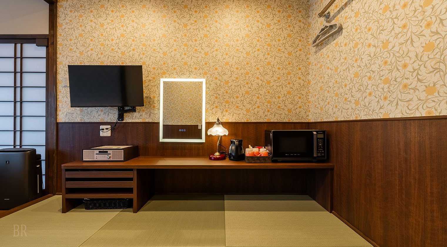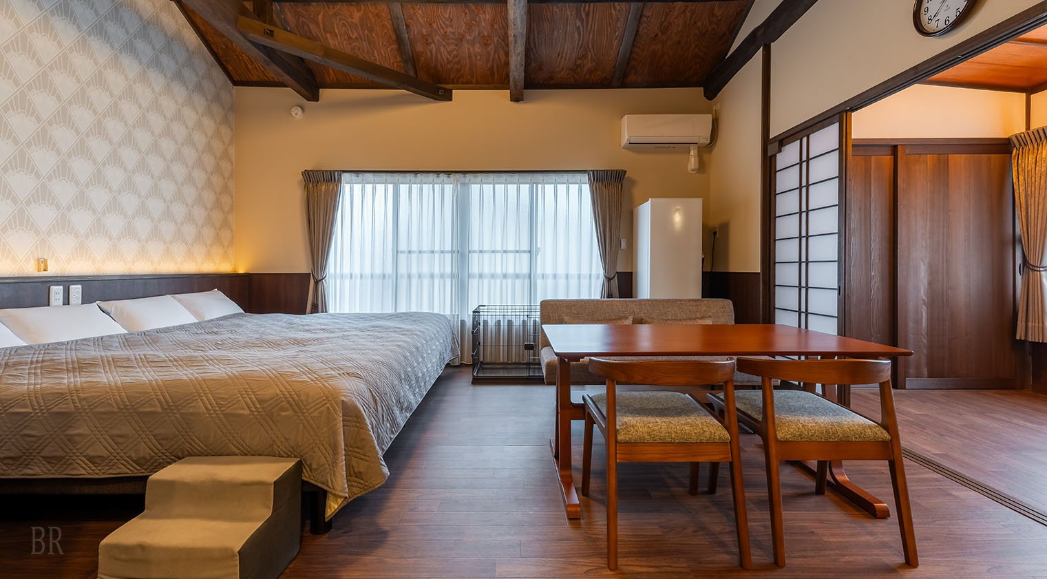 梁を見せる高い天井を持つSIN101は、美しいウィリアム・モリス壁紙を基調に温かみあるインテリアのお部屋です。ファミリーや団体さまに、和室スペースを寝室としてお使いいただけるよう寝具もご用意しております。