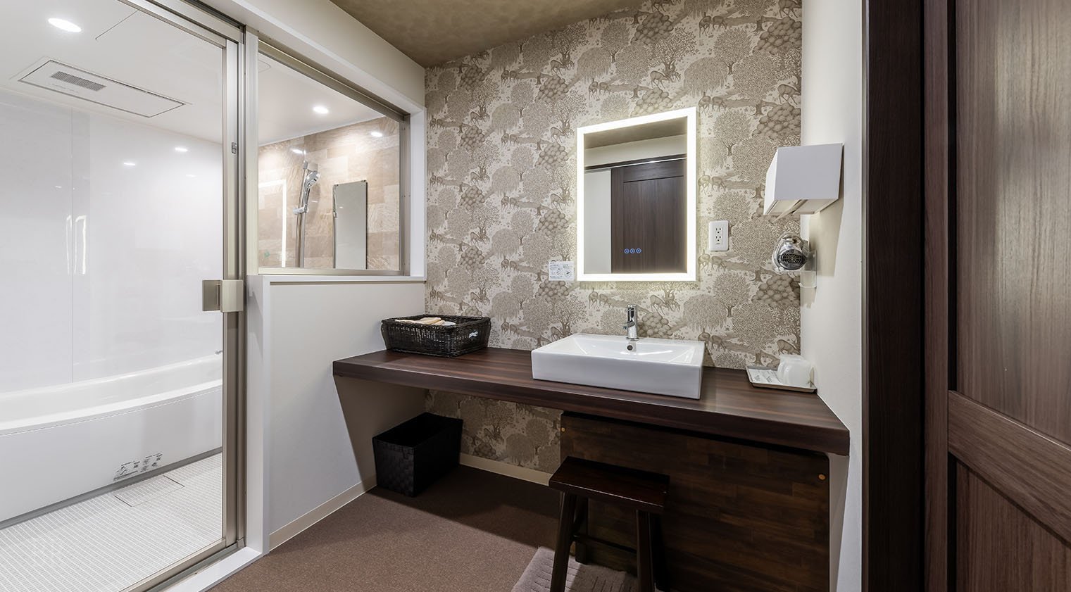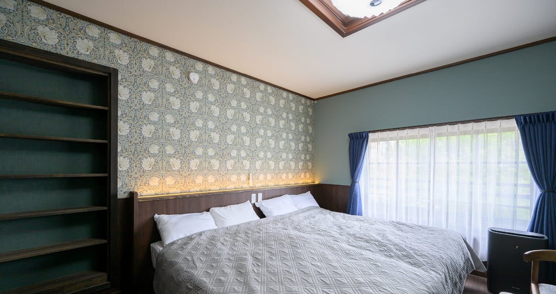 居室には植物柄が美しいウィリアム・モリス壁紙を一面に配した、落ち着きのあるお部屋です。水回りを1階に集めた設計で、おやすみの際も静かに過ごせるほか、コンパクトなお部屋でプライベートな旅にぴったりです。
